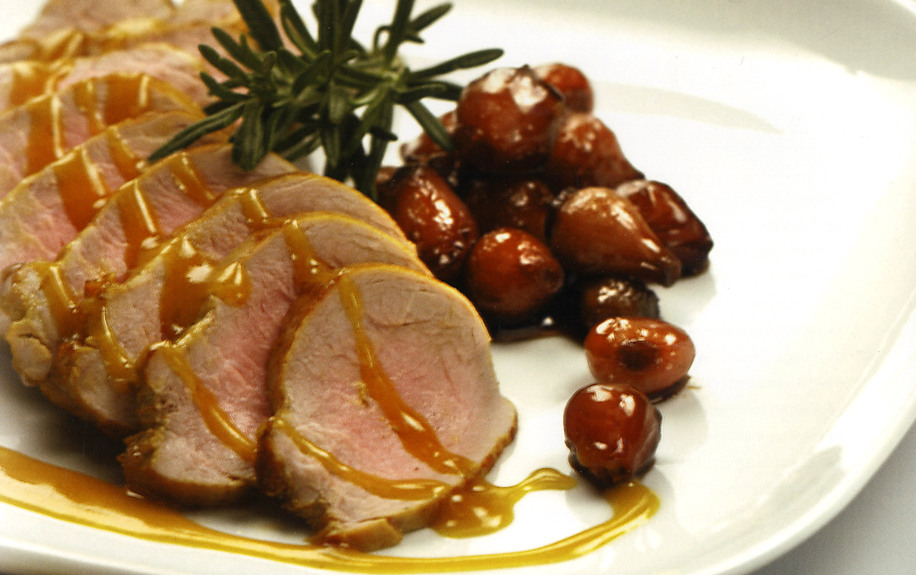 Σε ένα ταψάκι αναμιγνύουμε καλά το κρασί, το ελαιόλαδο, τη μουστάρδα, το αλάτι, το πιπέρι, το δενδρολίβανο και το θυμάρι. Βυθίζουμε στο μίγμα αυτό τα φιλέτα και προσθέτουμε τόσο νερό, όσο να φτάνει το υγρό ως την επάνω πλευρά του κρέατος.