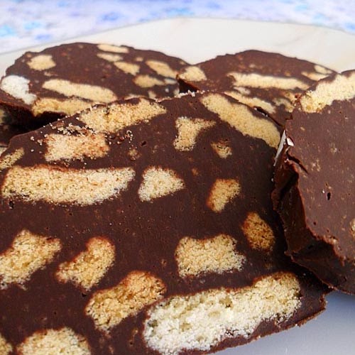 Σπάτε τα καραμελωμένα αμύγδαλα σε μικρά κομμάτια με ένα γουδί και τα βάζετε σε ένα μπολ. Σε ένα άλλο μπολ ψιλοκόβετε τα φρουί γλασέ αχλάδια. Σε ένα τρίτο μπολ σπάτε τα μπισκότα σε χοντρά κομμάτια. Ρίχνετε το Χωριό Soft Ανάλατο με Βούτυρο Αγελάδος στο μίξερ και το δουλεύετε σε χαμηλή ταχύτητα μέχρι να αφρατέψει λίγο. Αυξάνετε την ταχύτητα και ρίχνετε μέσα τη ζάχαρη κουταλιά-κουταλιά. Μόλις την απορροφήσει το βούτυρο ρίχνετε το κακάο σιγά-σιγά μέχρι να γίνει ένα ενιαίο σοκολατένιο μίγμα. Τέλος προσθέτετε το σφινάκι του κονιάκ και συνεχίζετε το χτύπημα για 1-2 λεπτά. Αδειάζετε το μίγμα το κακάο. Ρίχνετε μέσα τους καραμελωμένους ξηρούς καρπούς, τα σπασμένα μπισκότα και τα κομματάκια του φρουί γλασέ. Ανακατεύετε τα υλικά με ένα κουτάλι να πάνε παντού. Παίρνετε μια φόρμα του κέικ μακρόστενη, την ντύνετε εσωτερικά με διάφανη μεμβράνη και αδειάζετε το μίγμα του κακάο μέσα στη φόρμα πιέζοντάς το με ένα κουτάλι. Το ισιώνετε από πάνω και το κρυώνετε στο ψυγείο για τουλάχιστον 5-6 ώρες. Το ξεφορμάρετε σε μακρόστενη πιατέλα και το διακοσμείτε με τα κερασάκια που έχετε. Σερβίρετε σε φετούλες.