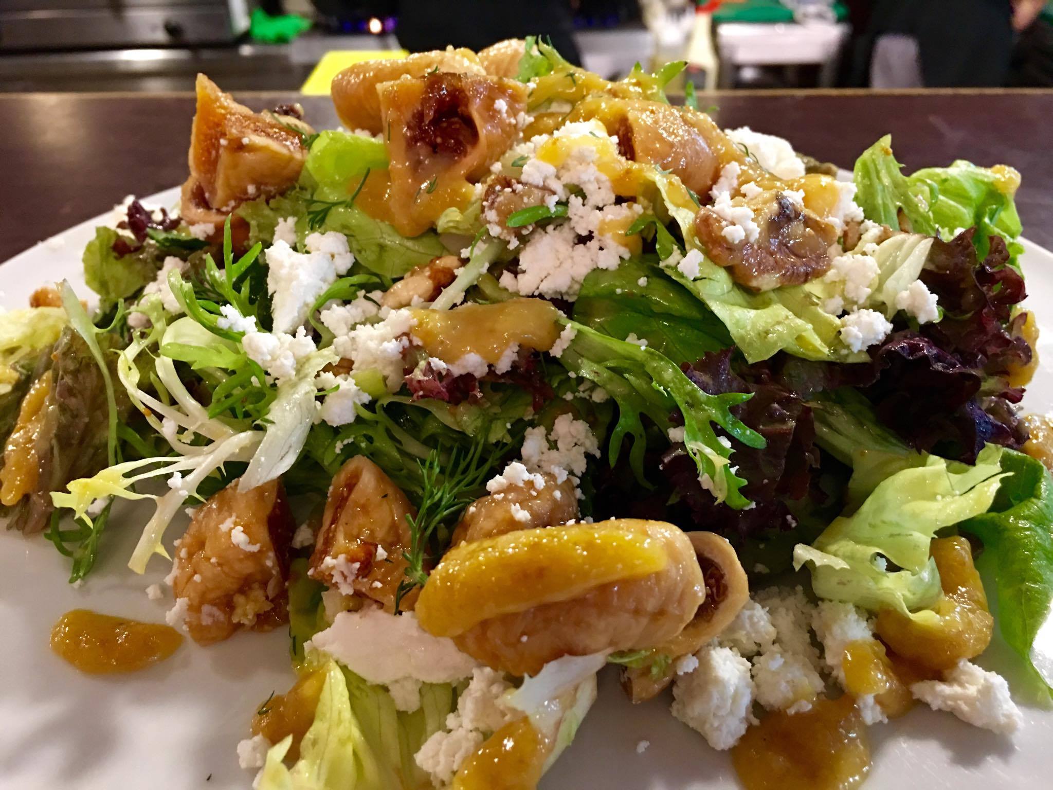 Σαλάτα με αποξηραμένα σύκα, καρύδια και dressing μουστάρδας με μπαλσάμικο
