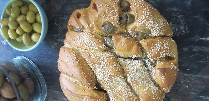 Ζεσταίνουμε το 1 φλιτζάνι νερό (τόσο ώστε να αντέχουμε να βάλουμε μέσα το χέρι μας). Λιώνουμε στο χλιαρό νερό τη μαγιά, προσθέτουμε τη ζάχαρη, μία κουταλιά αλεύρι και ανακατεύουμε καλά. Περιμένουμε 10 λεπτά να ενεργοποιηθεί η μαγιά (θα το καταλάβετε μόλις αρχίσει και βγάζει φουσκαλίτσες στην επιφάνειά της. Στη συνέχεια προσθέτουμε το υπόλοιπο νερό (επίσης ζεσταμένο ελαφρά), το ελαιόλαδο, το αλάτι, τις ελιές, τα 2/3 από τον πασατέμπο και το αλεύρι. Ζυμώνουμε να γίνει μια ομοιογενής ζύμη. Πλάθουμε ένα καρβέλι ψωμί. Απλώνουμε στον πάγκο τον υπόλοιπο πασατέμπο και ρολάρουμε το ψωμί μας πάνω σε αυτό για να κολλήσει εξωτερικά. Εναλλακτικά, πασπαλίζουμε το ψωμί μας από πάνω με τον υπόλοιπο πασατέμπο. Τοποθετούμε το ψωμί μας σε ένα ταψί, το σκεπάζουμε με μια πετσέτα και με ένα πάπλωμα και το αφήνουμε σε ζεστό μέρος μέχρι να διπλασιαστεί σε όγκο. Ψήνουμε στους 180 βαθμούς (χωρίς να προθερμάνουμε το φούρνο) μέχρι να πάρει το χρώμα που επιθυμούμε. Η συνταγή αυτή γίνεται και σε αρτοπαρασκευαστή, αλλά εκεί ρίχνουμε τα υλικά με τη σειρά που είναι γραμμένα, αφήνοντας τελευταία τη μαγιά, ώστε να μη βραχεί από τα υγρά υλικά. Τις ελιές και τον πασατέμπο τα ρίχνουμε μετά το πρώτο φούσκωμα της ζύμης, με τον ειδικό ήχο που βγάζει ο αρτοπαρασκευαστής.